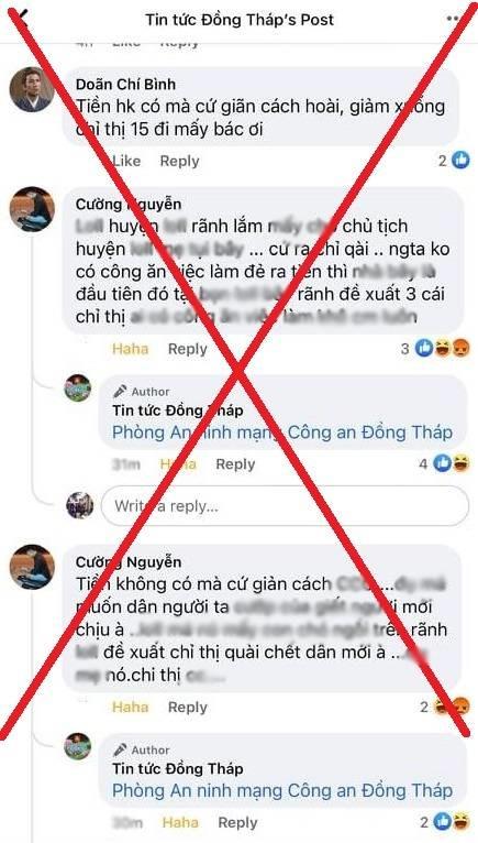 Trước đó, vào ngày 14/8/2021, Quản trị viên Fanpage Facebook “Tin tức Đồng Tháp” đăng tải nội dung “Huyện Cao Lãnh đề xuất tiếp tục thực hiện Chỉ thị 16/CT-TTg đến 26/8”, ngay sau đó tài khoản Facebook “Cường Nguyễn” vào bình luận bài viết trên với ngôn từ thô tục, xúc phạm nặng nề danh dự, nhân phẩm, uy tín của tổ chức và xuyên tạc công tác phòng, chống dịch bệnh Covid-19 như: “chó…”, “đ.m nó”, “c.c”, “chi thị cc…” (xin phép không trích nguyên văn do lời lẽ quá tục tĩu!!!). Sau khoảng thời gian ngắn (hơn 30 phút) bình luận, được người thân khuyên răn, đương sự đã tháo gỡ bài viết, đồng thời xoá hình đại diện (avatar) và đổi tên tài khoản Facbook thành “Wgqg Gwshe” hòng đối phó với cơ quan chức năng.